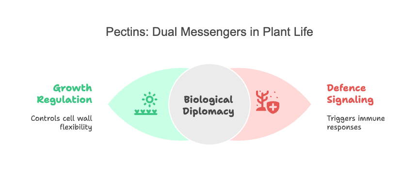 Thus, pectins form the dual language of growth and defence — a kind of biological diplomacy where the same molecules can either open pathways for expansion or trigger emergency fortification.
